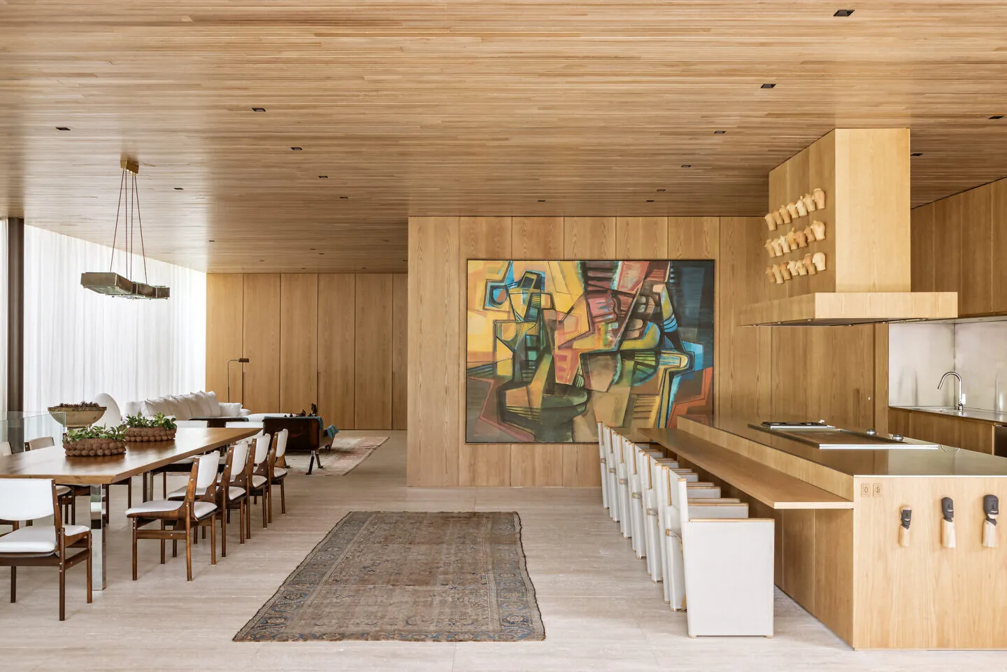 Projeto luminotécnico de cozinha americana apresenta desafios únicos. É necessário criar cenários diferentes que atendam trabalho culinário e conforto da sala integrada simultaneamente.
